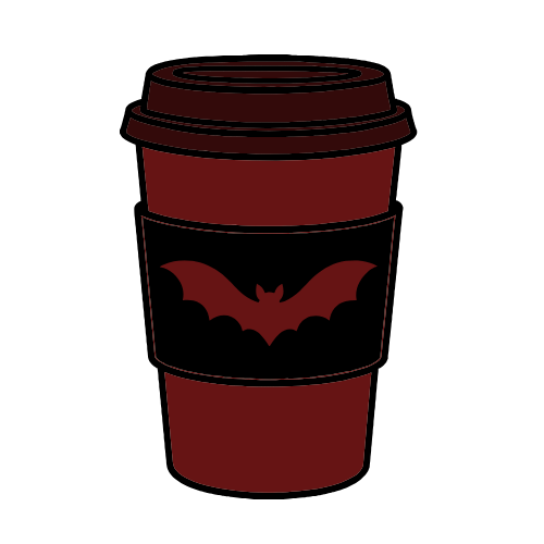 Orange and brown coffee cup with black bat and writing saying