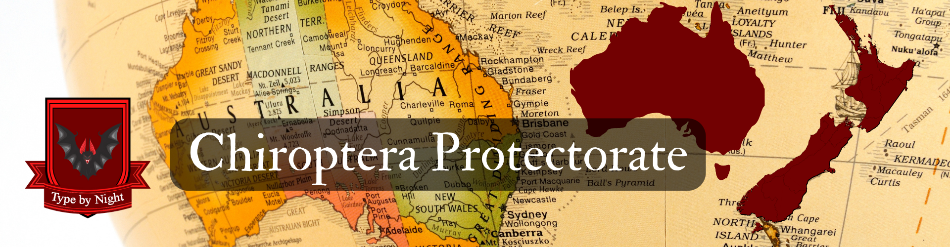 The current Chiroptera Protectorate is made up of the former countries of Australia and New Zealand, as well as surrounding islands. It is ruled and protected by House Chiroptera and functions as a constitutional monarchy, with Queen TaraFaeBelle at it's head. The immense area is broken up into states. Six of these come from what used to be Australia: New South Wales, Victoria, Queensland, Western Australia, South Australia, and Tasmania. The rest are regions of former New Zeland: Northland, Auckland, Bay of Plenty, Waikato, Gisborne, Taranake, Hawke's Bay, Manawatu-Wanganui, Tasman, Nelson, Wellington, West Coast, Marlborough, Canterbury, Otago and Southland.