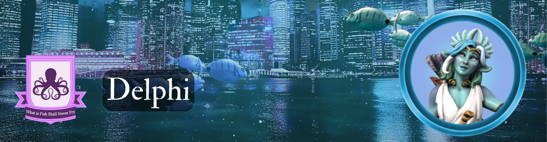 Delphi is an Aquatic Centaur who first appeared near House Mollusca just before April 2026. Welcomed into the fold, she is curious about everything. She is a priestess of Apollo and part of the herd of aquatic centaurs entrusted to run the Oracle of Delphi back in the day. Now, she is wandering around and hopes to make the world better, even if only by small bits. While not very strong, Delphi can be a mean opponent. She really hates fighting, though, preferring diplomacy. In her opinion, violence is the last tool to pick up.
