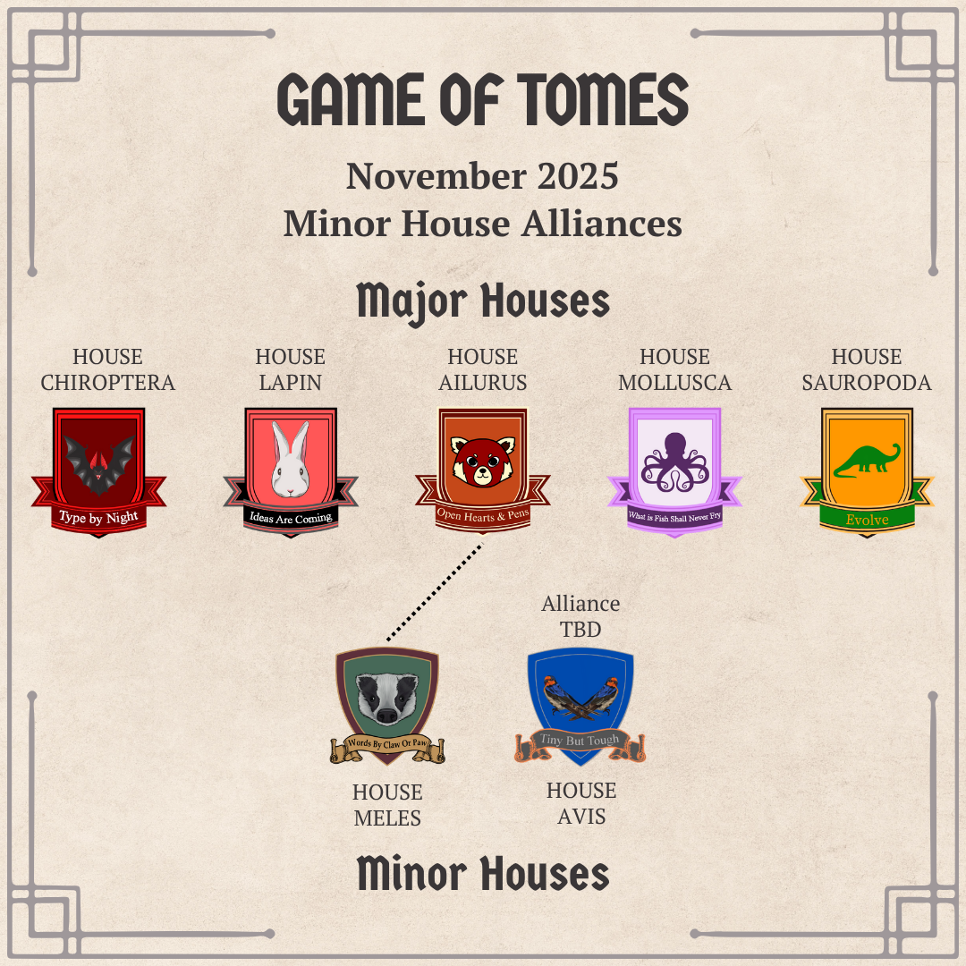 The Game of Tomes is a House based writing competition. We provide virtual write-ins with a competitive (but friendly) spirit. November is when the Game of Tomes Word Wars occur. They begin on the first of the month, and end on the last day of the month, in each participant's time zone. In this Word War, the "living" writers will vie against the Kitsune-gumi leading The Undead Horde. At every results stream, the House with the lowest word count is overrun by the Horde. One third of the House's writers will join the undead horde and are determined by the "Wheel of Doom". The wheel randomly selects the writers from a list of the House's participating members. (Writing for either side, living or undead, is fun!) During the final results stream, we find out if the living or the undead are victorious. Each possibility has Tomeverse lore consequences!Full rules and word counting instructions are posted on the Game of Tomes (GoT) homepage.