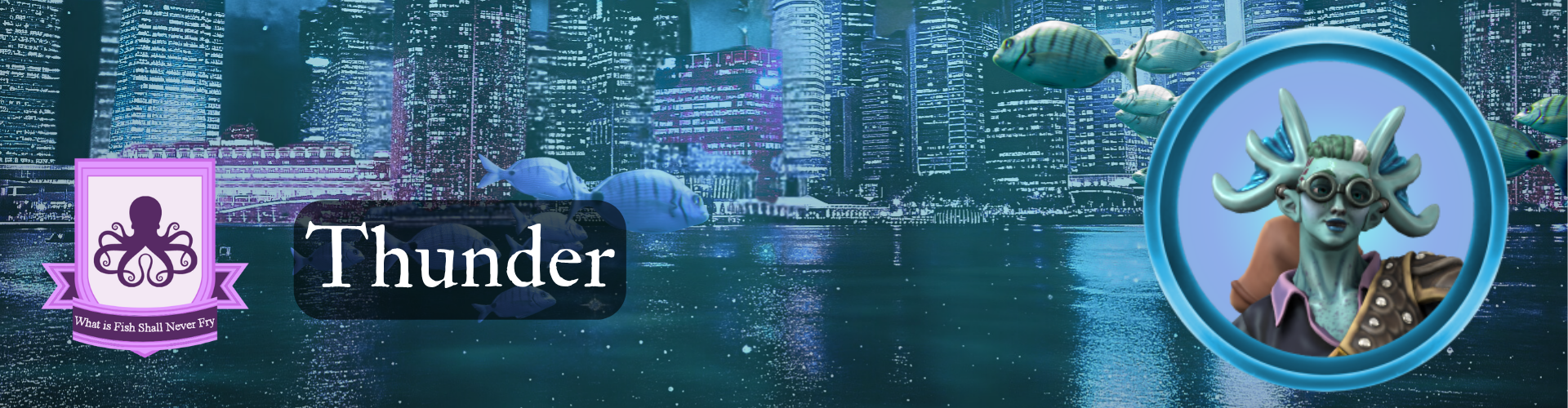 Much of Thunder's history has is lost to the currents. Once a captain of a submarine crew, xyr path in life took a sharp detour when Thunder was drifting unconscious in the deep for 23 to 78 hours before a group of Molluscans found xem and brought xem to Zafforza City... Alone.