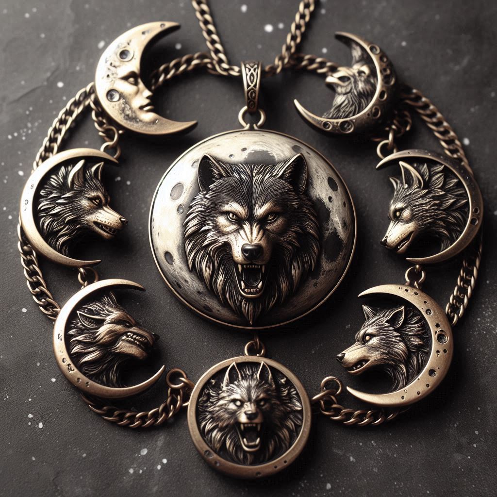 Ez a különleges medál gazdag részleteivel azonnal kiemelkedik. A központi eleme egy kör alakú, szövevényesen kidolgozott holdfelszín, amelynek közepén egy farkasfej dominál. A farkas tekintete erőt és határozottságot sugároz, mintha mindig éberen őrizné a vérvonalát. A medál szélén kicsiny holdak és farkasfejek sorakoznak, amelyek tovább hangsúlyozzák az ősi összetartozást. A láncok finoman illeszkednek a medál keretéhez, mintha a hold szövetei és ereje tartaná össze őket. Az egész alkotás arany és bronz árnyalatban ragyog, a Fenrir Bloodmoon vérvonalának erejét és vezetői auráját tükrözve.