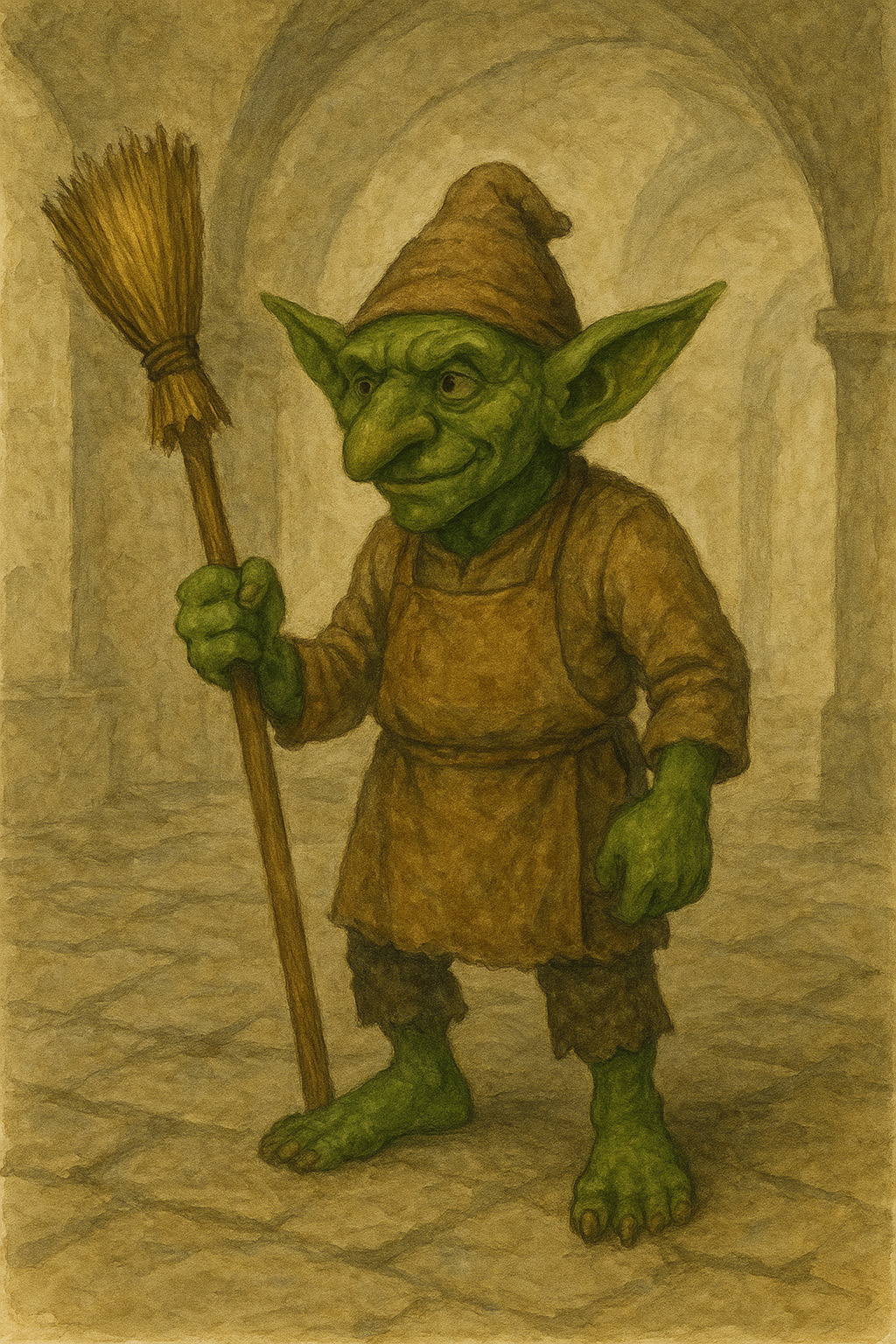A goblin janitor, encountered guarding the jail cell of a rogue while the other goblins were out. Who knows what else he knows, and what he might be hiding.