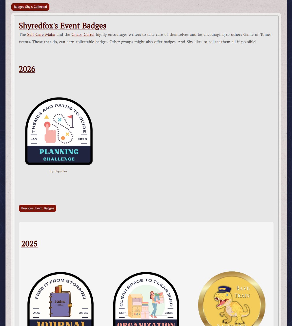 I started putting the badges I earned on my character page, Princess ShyRedFox. It was just a nice way to remember what I participated in.