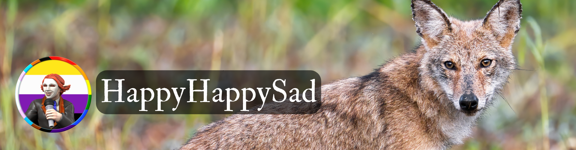 Happyhappysad's pronouns change depending on their mask. While unmasked and among the living, she uses exclusively she/her pronouns. While wearing her everyday mask, the Comedy Theater mask, she uses a combination of she/her and they/them, favoring she/her. While wearing her War mask, the Tragedy Theater mask, they use a combination of she/her and they/them, favoring they/them. While undead, they use exclusively they/them.