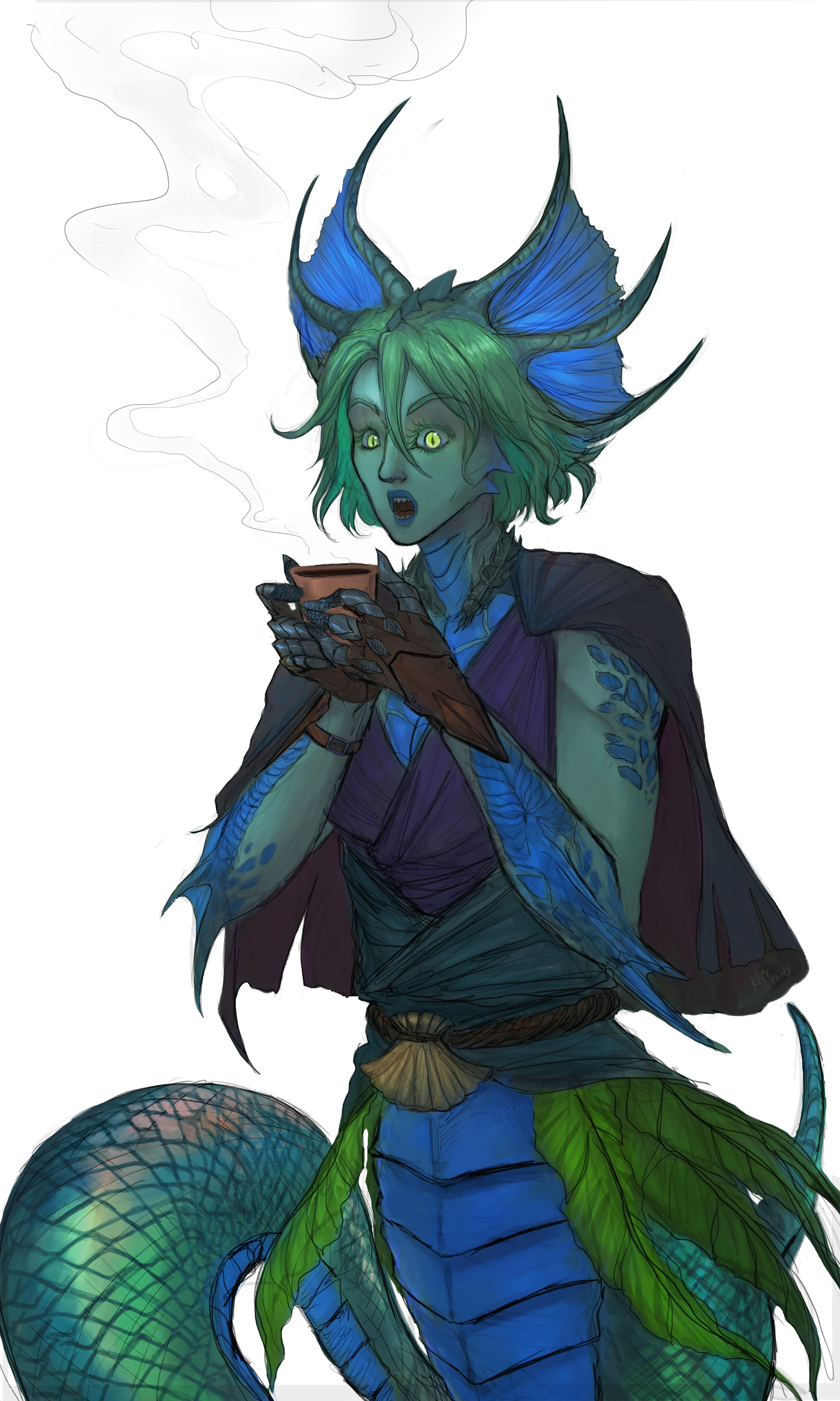 Olivette wears a lot of flowy clothing, so it looks one with the water. All their outfits are cool or earth toned. Their trident was crafted by their partner as a gift once Olivette's mutation was discovered.